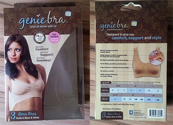 Размер бюстгальтера Джини Бра (Genie Bra), российский размер: Обхват всей груди в см: S (42-44) 70-81 M (44-46) 80-91 L (48-50) 92-101 XL (50-52) 103-111 XXL (52-54) 112-123